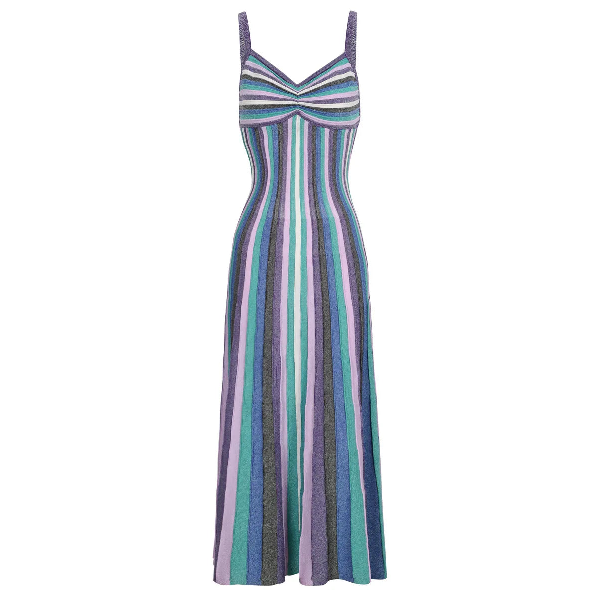 Elevate your spring and summer wardrobe with the Striped Knit Maxi Dress. This beautifully crafted dress features a shaped bust and slim spaghetti straps, offering a flattering silhouette for any occasion.