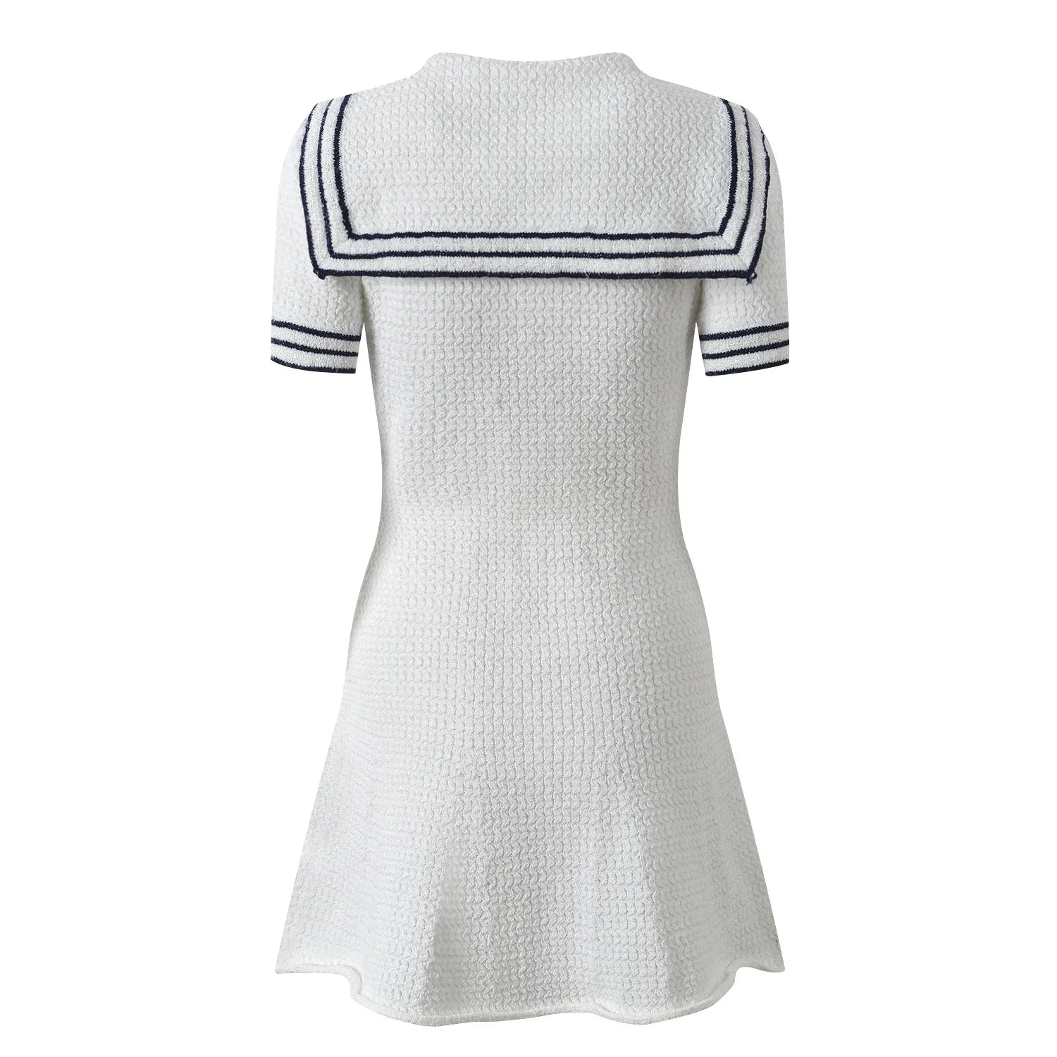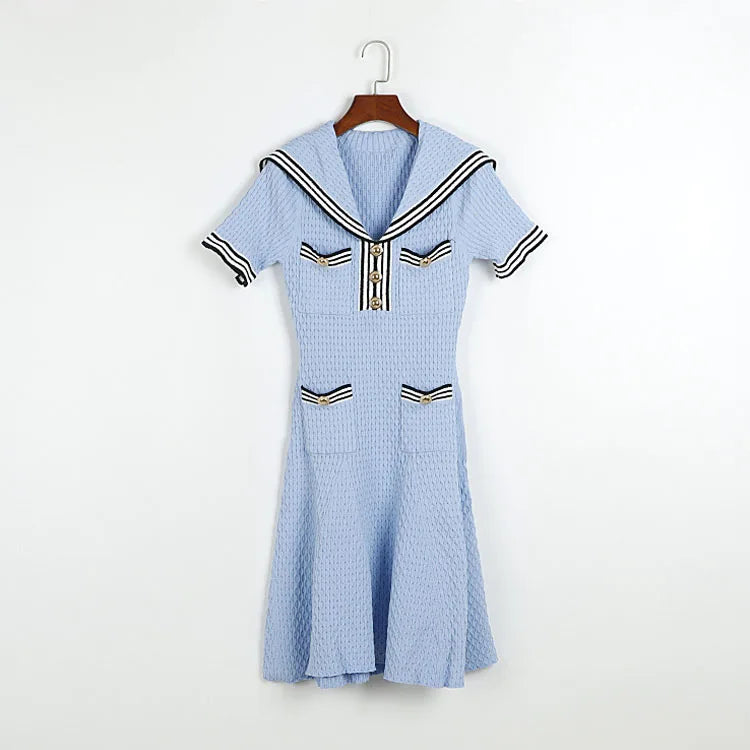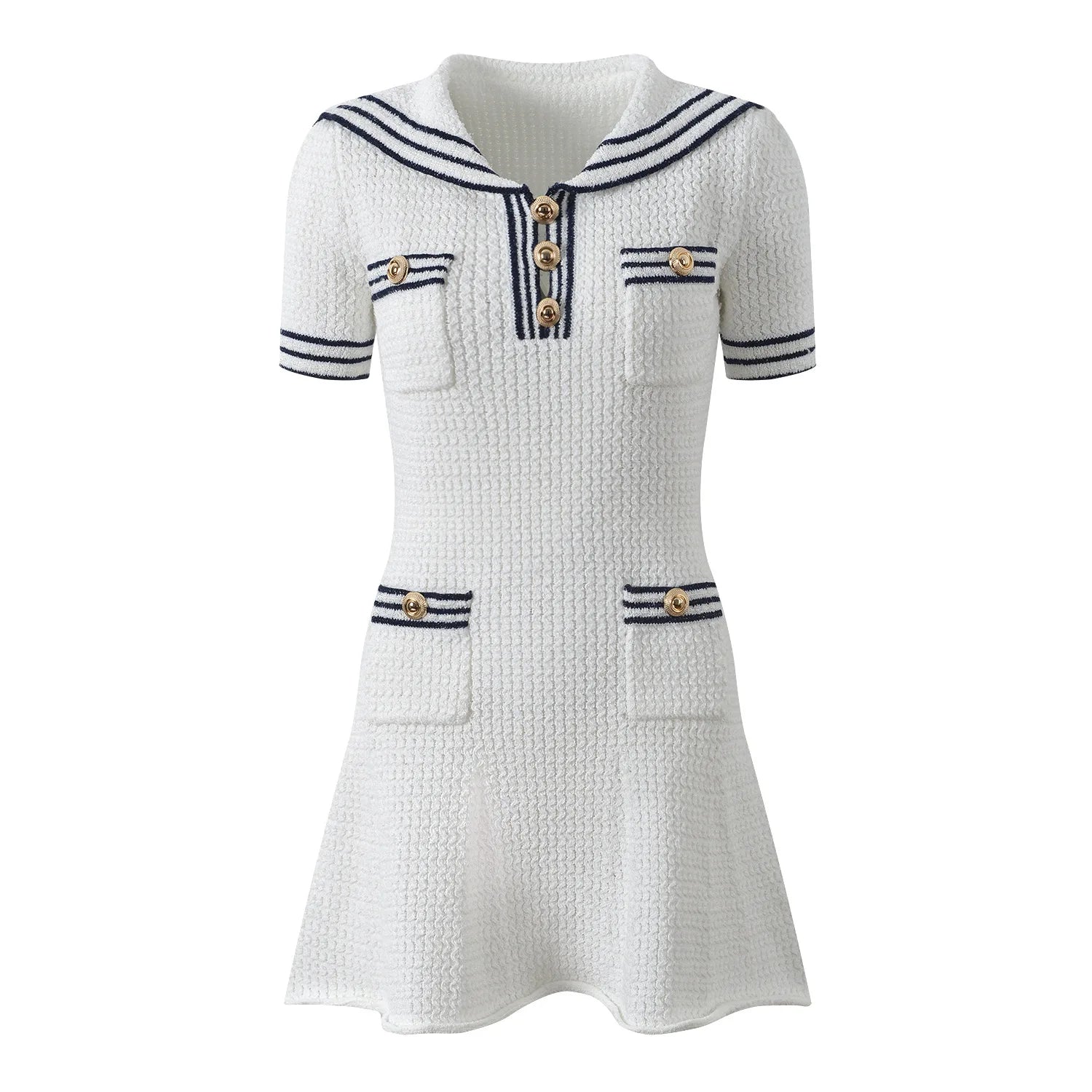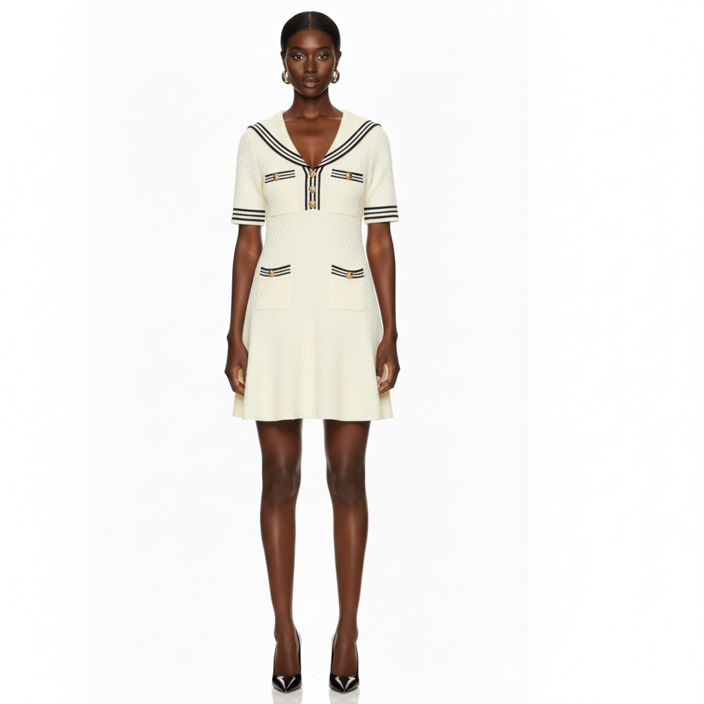 Step into effortless style with the Textured Knit Mini Dress featuring a charming nautical collar and handy pocket accents. Crafted for comfort, this dress is made of high-stretch knitting that hugs your silhouette in all the right places.
